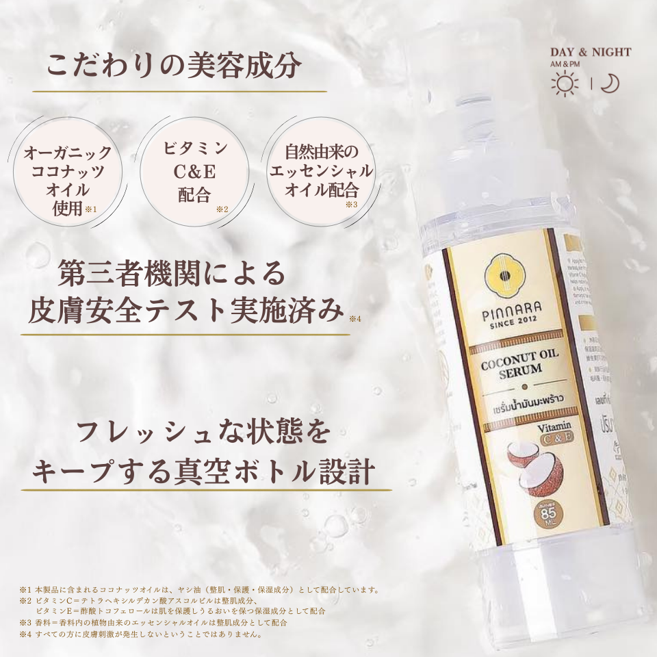 PINNARAのココナッツオイルセラムは、オーガニック認証を受けたバージンココナッツオイルを贅沢に配合。化学物質を一切含まず、化学処理も行わないピュアなオイルのみを使用しています。コールドプレス製法でじっくり抽出することで、ココナッツの持つ栄養やうるおい成分を最大限に引き出しました。